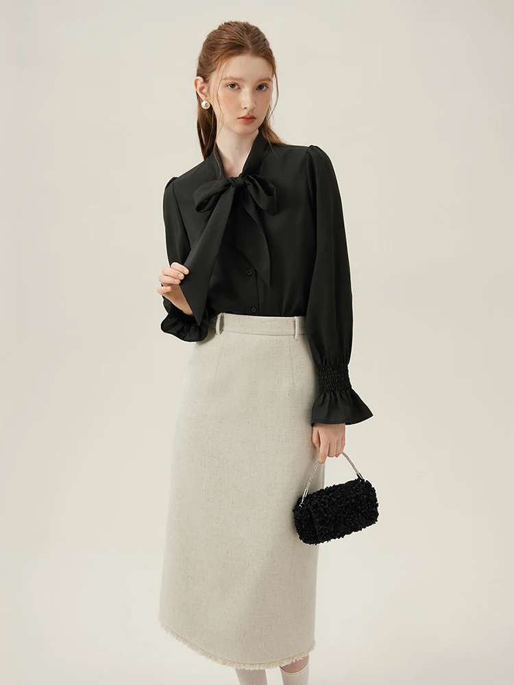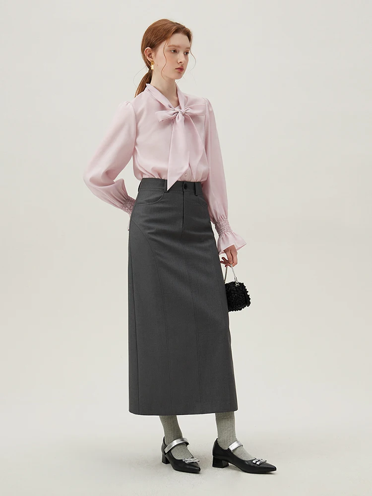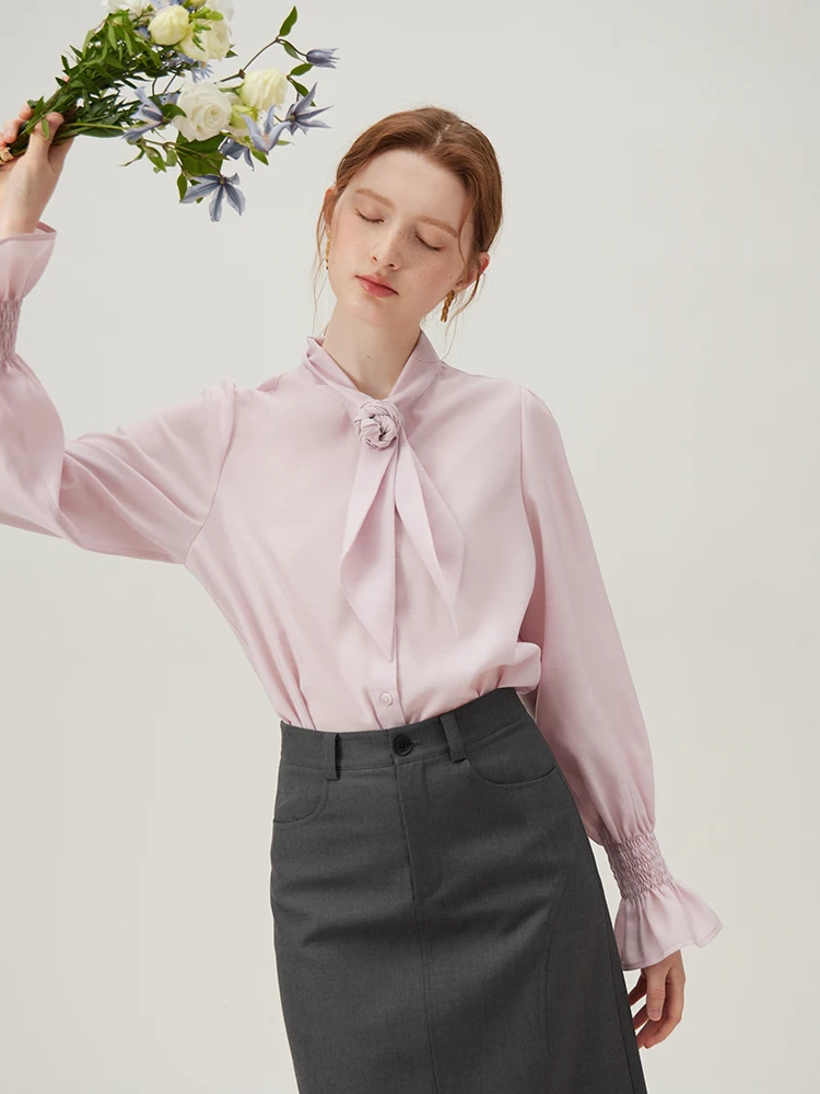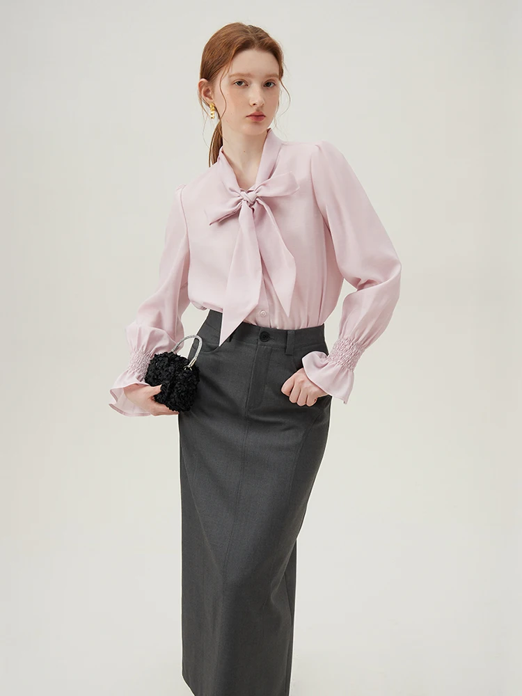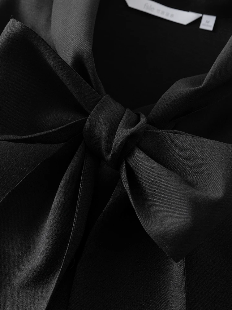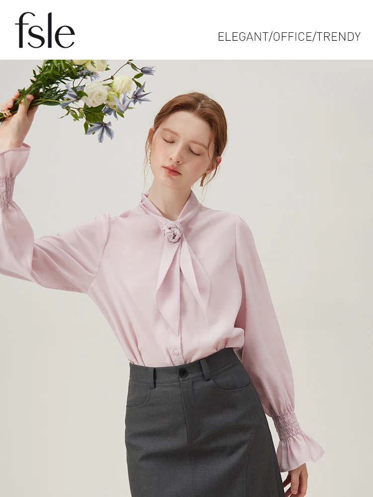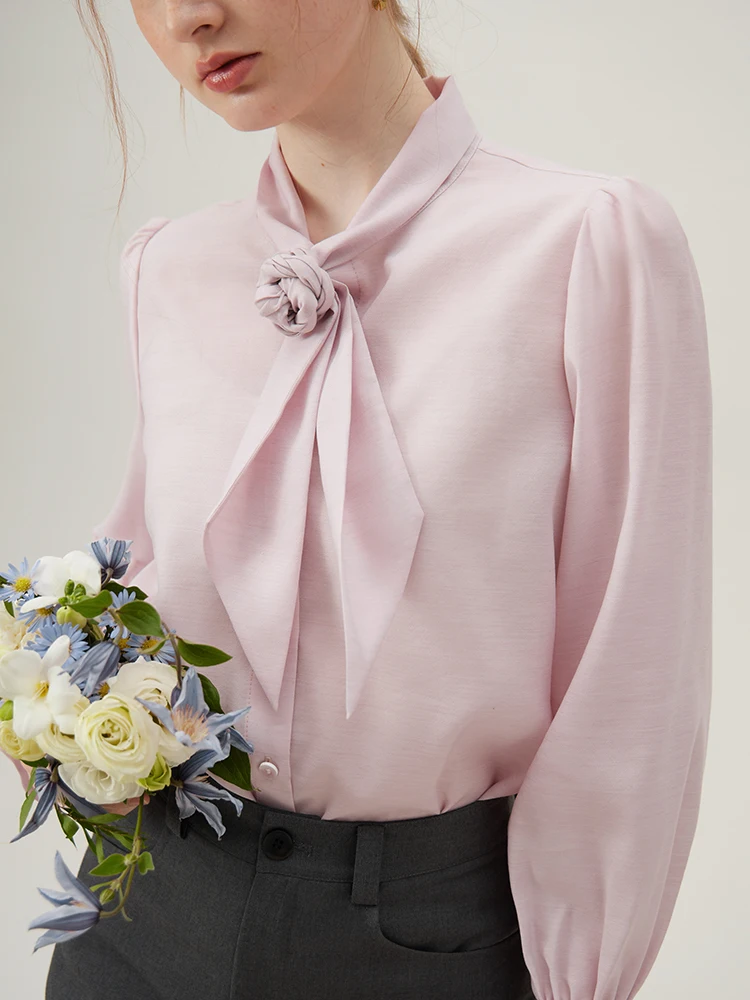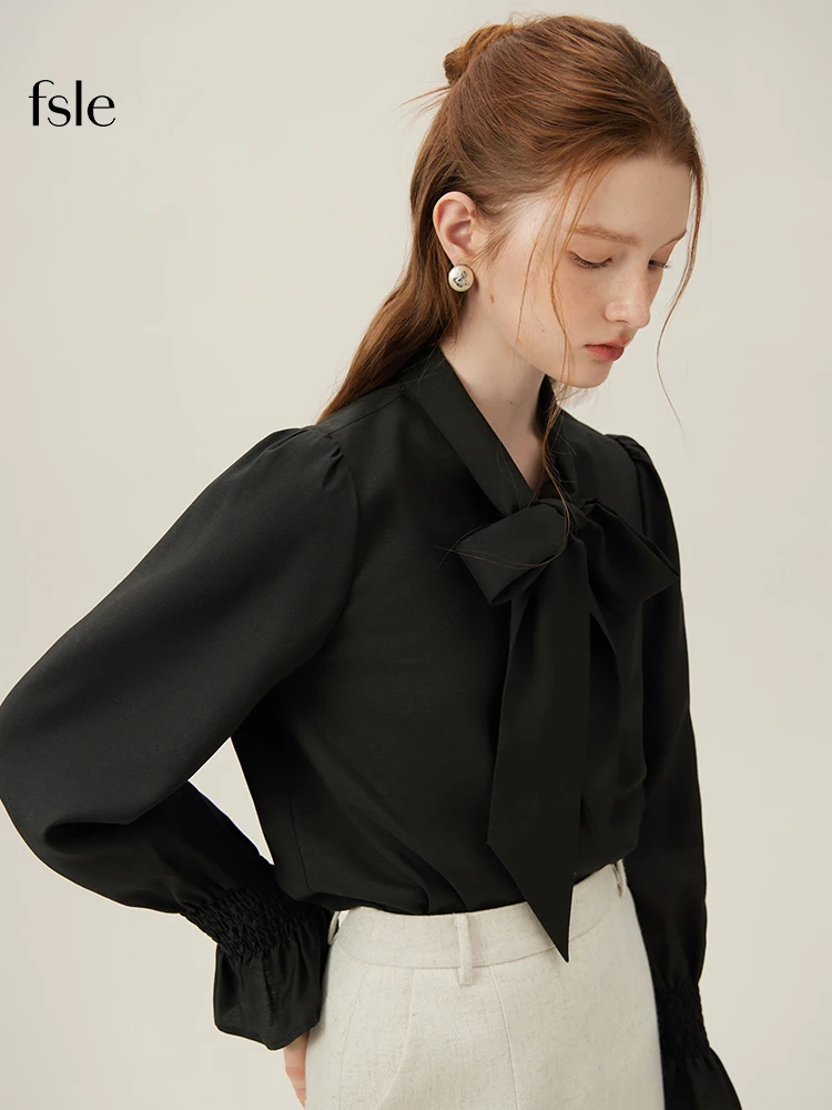 FSLE French Bow Shirt Women's Spring 2024 New Long sleeved Ribbon Shirt Pink Black Women Casual Loose Shirts 24FS11262